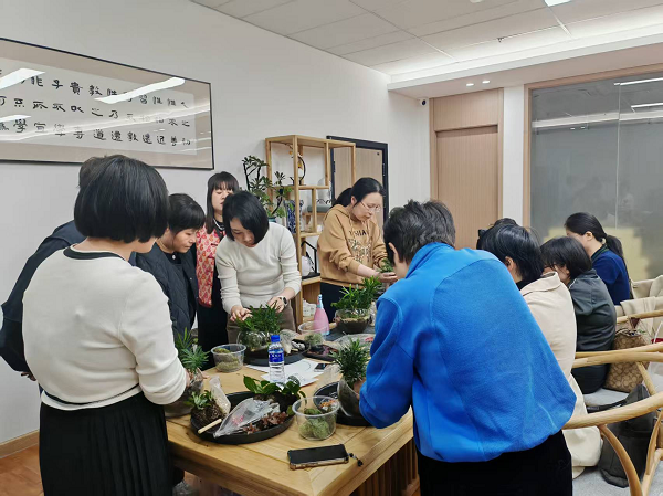 随后的苔藓微景观DIY环节充满创意与趣味,工作人员提前准备了花盆、苔藓、绿植、土壤、小石子、喷水壶等材料,大家认真铺设底土、种植绿植、摆放装饰,将小巧的玻璃盆化作承载自然与诗意的微缩世界。大家一边制作一边交流,欢声笑语不断,在动手实践中释放压力,在协作互动中增进情谊。